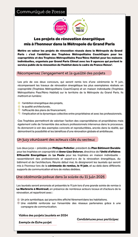 Mettre en valeur les projets de rénovation réussis dans la Métropole du Grand Paris : c’est l’ambition des Trophées Métropolitains CoachCopro pour les copropriétés et des Trophées Métropolitains Pass’Réno Habitat pour les maisons individuelles, organisés par Grand Paris Climat avec les 9 agences qui portent le service public de la rénovation de l’habitat dans le cadre de France Rénov’.